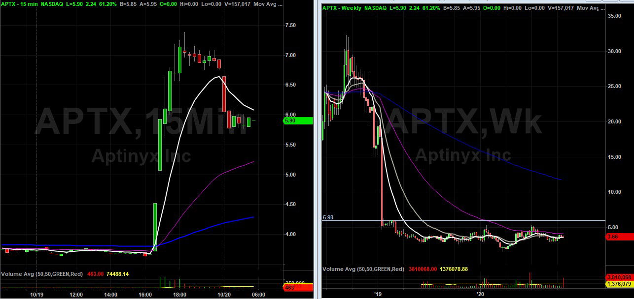 חברת ביו טכנולוגיה, הודיעה על הצלחה בשלב 2 בפיתוח תרופה להפרעת פוסט טראומה, וככל הנראה יש לא מעט חולים בעולם, החברה ביצעה את הניסוי על 153 חולים ולמרות שמדובר בחולים שקשה לטפל בהם תרופתית התרופה הראתה הצלחה. המנייה זינקה באפטר כמעט 82% ולאור השווי הנמוך שלה נראה שאין כאן תמחור יתר (עלתה בשווי בסביבות 142M$) ביחד עם פלוט יחסית נמוך (39M מניות) יש לה עוד סיכוי לזוז. יש לחברה סה"כ 3 תרופות בקנה וכולן בשלב 2.