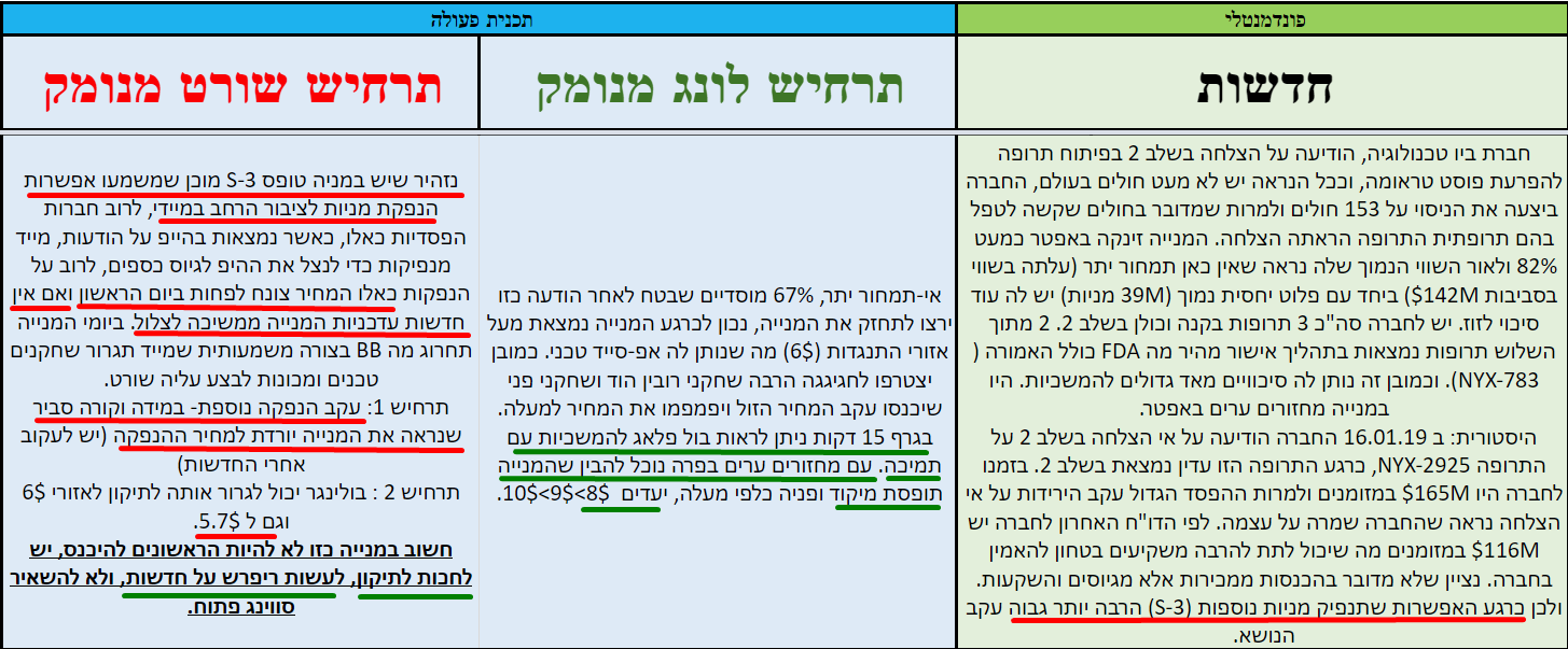 ב 16.01.19 החברה הודיעה על אי הצלחה בשלב 2 על התרופה NYX-2925, כרגע התרופה הזו עדין נמצאת בשלב 2. בזמנו לחברה היו לחברה 165M$ במזומנים ולמרות ההפסד הגדול, עקב הירידות על אי הצלחה, נראה שהחברה שמרה על עצמה. לפי הדו"ח האחרון לחברה יש 116M$ במזומנים מה שיכול לתת להרבה משקיעים בטחון להאמין בחברה. נציין שלא מדובר בהכנסות ממכירות אלא מגיוסים והשקעות ולכן כרגע האפשרות שתנפיק מניות נוספות (S-3) הרבה יותר גבוה עקב הנושא.
