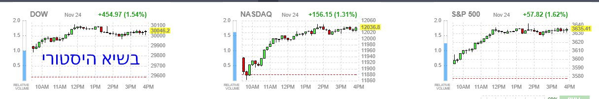 לדעתנו השוק כן אהב את ההודעה על העברת המידע והשיתוף עם הנשיא הבא, זה מבהיר מעט את חוסר הבהירות שהייתה ונותן לשוק להבין שהממשל יעבור ללא בעיות מיוחדות וכעת מעל ל 3000 נק' במדד הדאו- גו'נס זה נותן את יריית הפתיחה להמשך ולמה שעתיד לבוא בטח עם החיסונים בשטח. יש לזכור שהעברת הממשל באופן מסודר אומרת גם העברת תוכנית התמריצים שהייתה די תקועה מאז הבחירות, נותנים עוד תקוות הן לחברות והן לעסקים הקטנים והן לציבור מה שמעודד את השוק למעלה.
